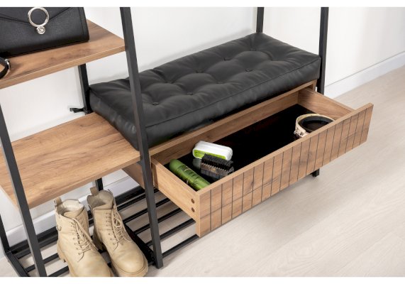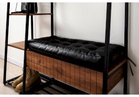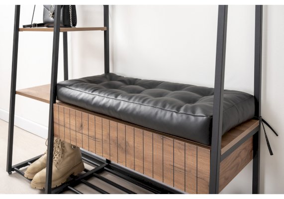 Сиденье с мягким элементом из кожзама, съёмная металлическая полка для обуви.