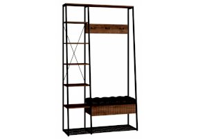 Металлические стойки, открытые полки, крючки. Один выдвижной ящик на направляющих скрытого монтажа с доводчиками.