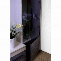 Если вы считаете, что хранить в гостиной посуду уже не модно, шкаф со стеклянной дверцей и стеклянными полками станет отличной витриной для дорогих и любимых фотографий и памятных вещиц. Стеклополки в обработке еврокромкой выдерживают до 10 кг каждая. Их можно декоративно подсветить с помощью светодиодной подсветки (в комплекте не поставляется, приобретается отдельно). Фасад перенавешивается на левую и правую сторону. Серебристая стильная ручка из массива дерева и серое тонирование стекло фасада вносят смелые дизайнерские штрихи в восприятии актуального декора "под бетон".