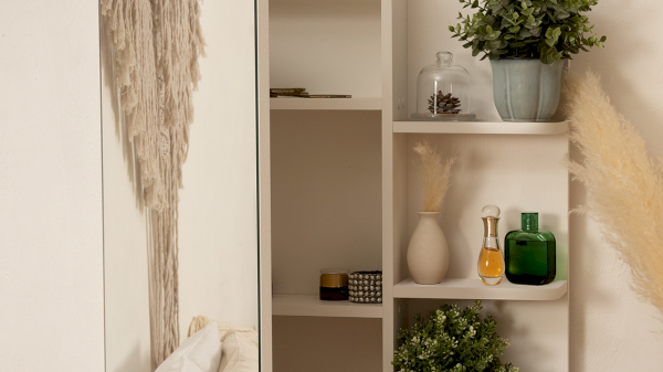 Несмотря на свои компактные размеры, туалетный стол имеет функциональный ящик с шариковыми направляющими для хранения парфюмерии, достаточно вместительную столешницу, где можно разместить все необходимые аксессуары и полноценное зеркало, которое имеет дополнительное место с полками для хранения за дверцей.