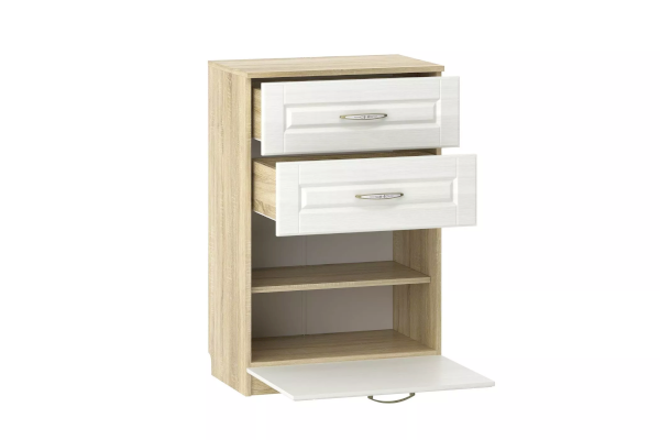 Тумба Оливия НМ 040.45 Х обеспечит аккуратное хранение обуви в прихожей. Для этого лучше всего подойдет нижнее отделение с полкой, скрытое за откидным фасадом. За счет встроенных газлифтов дверца открывается плавно. В верхней части тумба оборудована двумя выдвижными ящиками, в которых можно хранить средства по уходу за обувью, ключи.