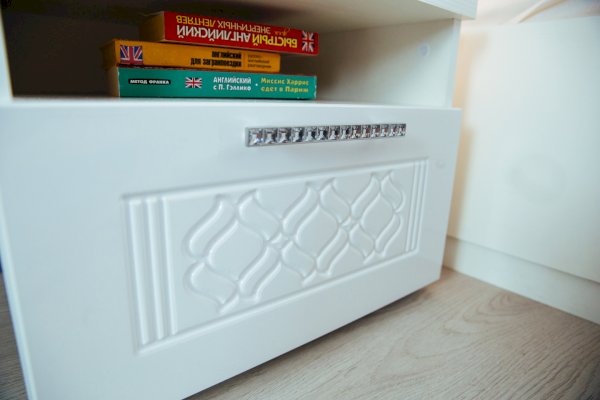 1. Белые глянцевые фасады МДФ с фрезеровкой «Орхидея», украшенные ручками с кристаллами.