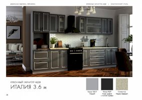 Кухонный гарнитур «Италия» воплотил в себе роскошь и эстетизм этой прекрасной средиземноморской страны. На суд покупателей представлены комплекты с отделкой под графит, платину, беленый дуб, а также великолепные модели фисташкового цвета. Шикарный вид придают дизайнерская фурнитура, дверцы шкафчиков из рифленого стекла, золоченные прямоугольники на фасадах.