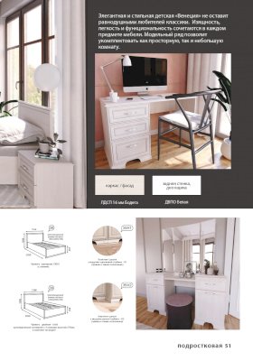 Элегантная и стильная детская Венеция не оставит равнодушными любителей классики. Изящность, легкость и функциональность сочетаются в каждом предмете мебели. Модельный ряд позволит укомплектовать как просторную, так и небольшую комнату.